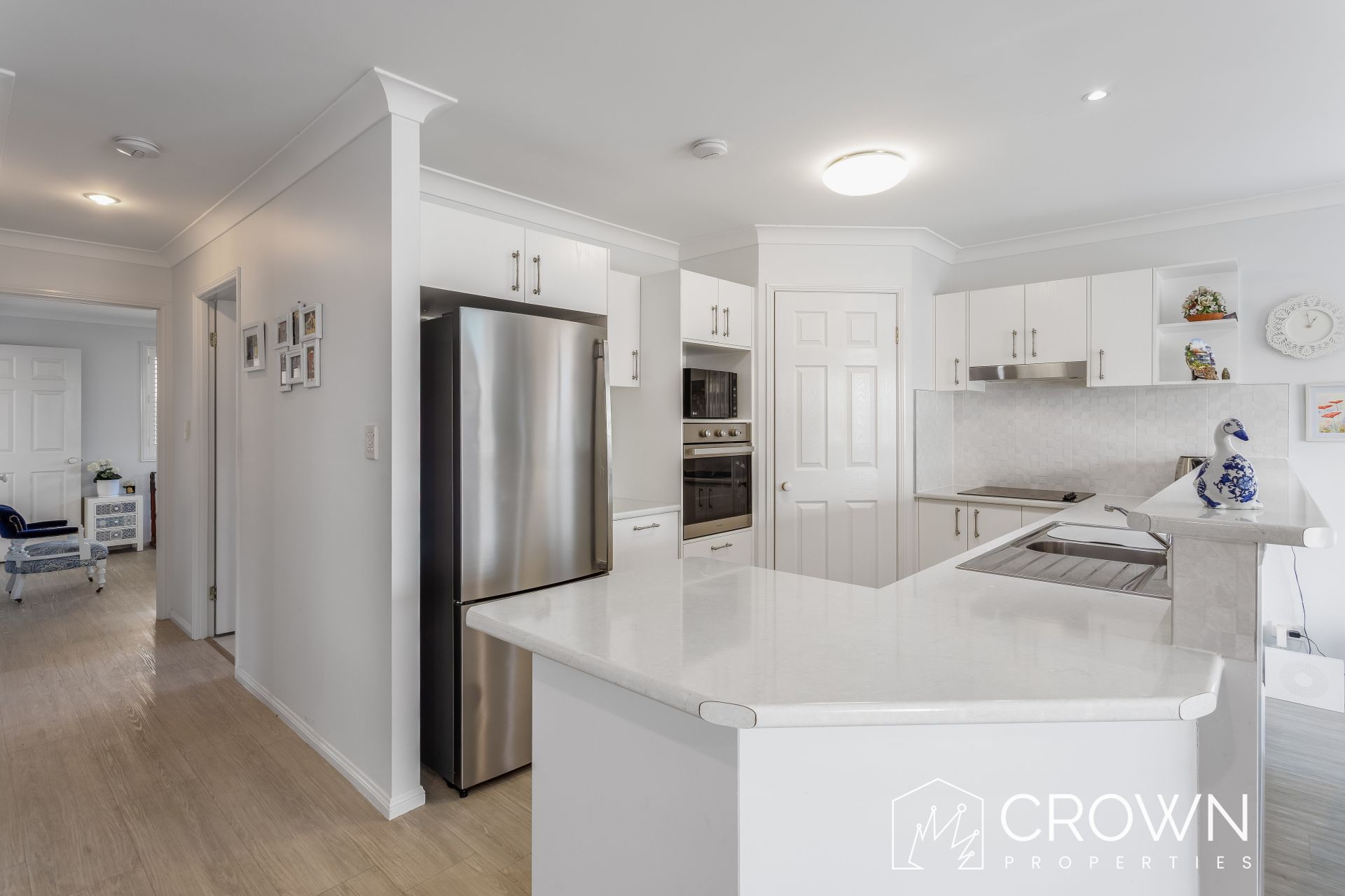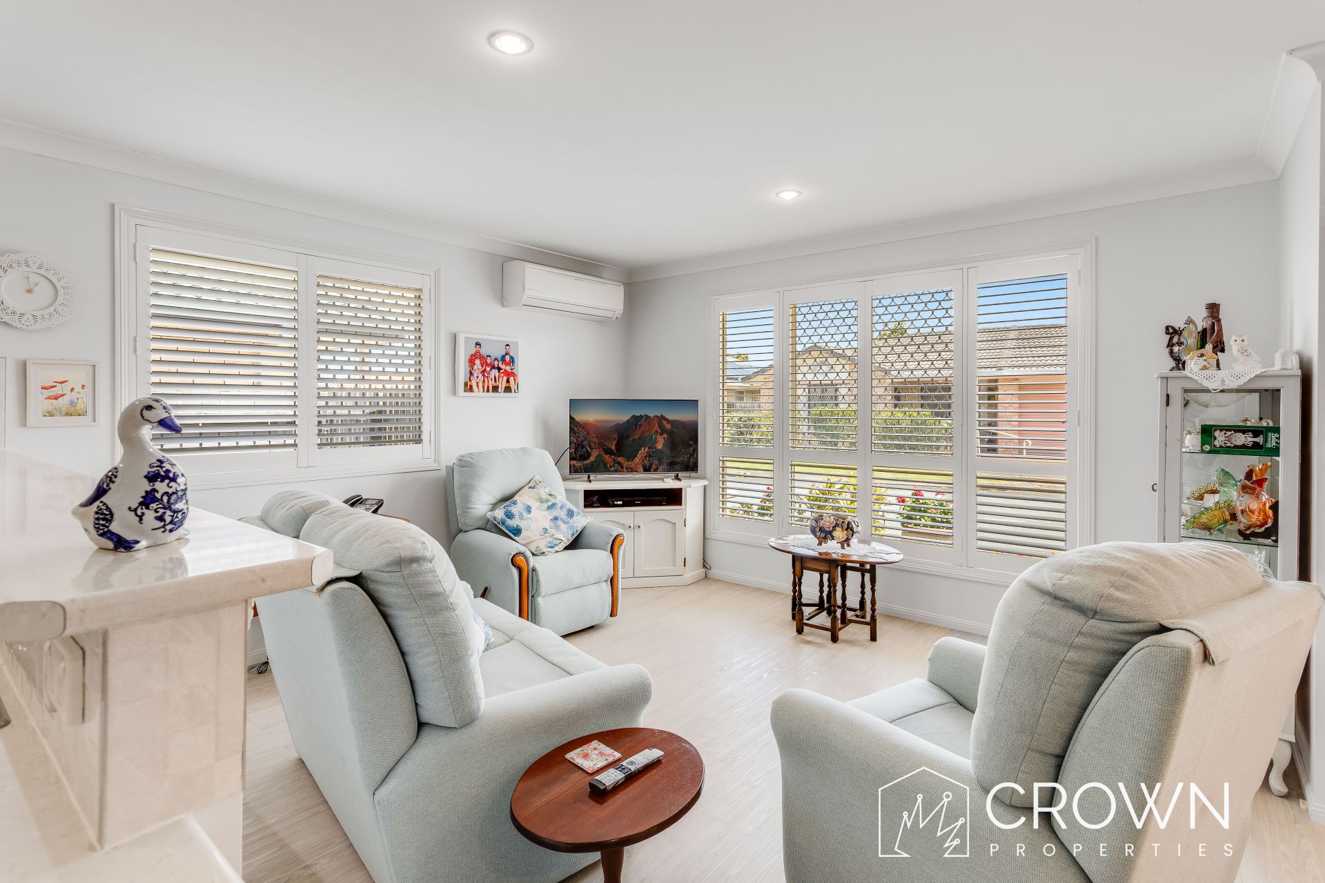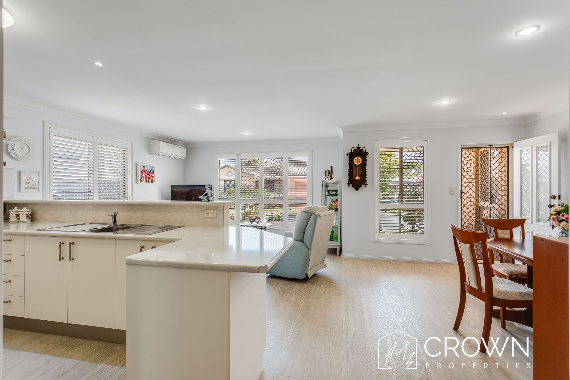 Step inside to discover a spacious open-plan living and dining area, complemented by stylish flooring, elegant shutters, and air conditioning to ensure year-round comfort. The bright, modern kitchen is a standout, boasting an abundance of cupboard space, generous benchtops, and a walk-in pantry – perfect for those who love to cook and entertain.